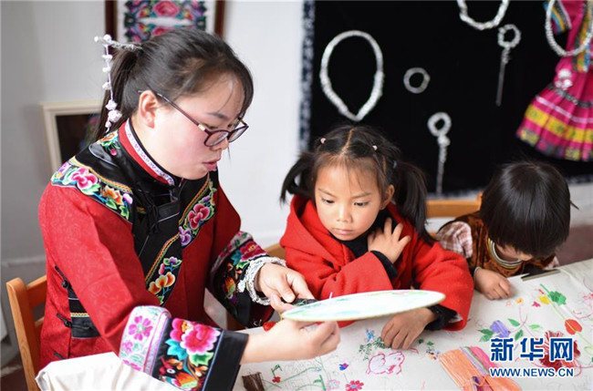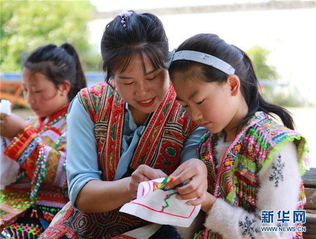 5月14日,在畢節(jié)市黔西縣協(xié)和鎮(zhèn)立新村立新小學(xué),孩子在老師的指導(dǎo)下練習(xí)刺繡。新華社發(fā)(周訓(xùn)超 攝)