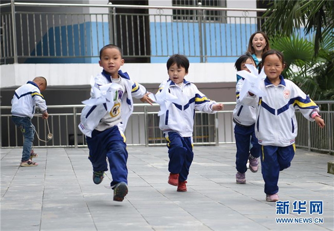5月14日,在銅仁市松桃苗族自治縣盤石鎮(zhèn)響水洞村的山村幼兒園,孩子們在玩自己制作的紙風(fēng)車。新華社發(fā)(龍元彬 攝)