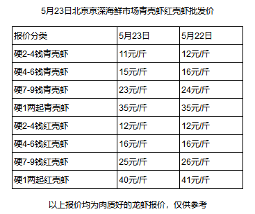 水產(chǎn)養(yǎng)殖網(wǎng)今早上傳的5月23日北京京深海鮮市場紅殼蝦青殼蝦批發(fā)價(jià)顯示,個(gè)頭最?。?-4錢/只)、最便宜的小龍蝦批發(fā)價(jià)僅需11元/斤,比昨天又降了1元。而湖南、江蘇、廣東等地的價(jià)格也和北京差不多,武漢甚至低至9元/斤。