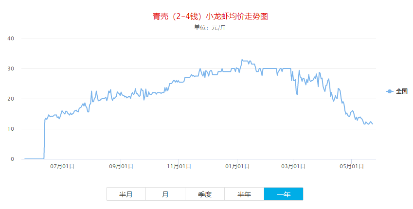 5月23日發(fā)布的一年期全國小龍蝦批發(fā)價(jià)走勢圖 圖片來源:小龍蝦價(jià)格網(wǎng)