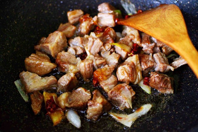 11.大火翻炒至所有的食材和調(diào)料混合均勻后。