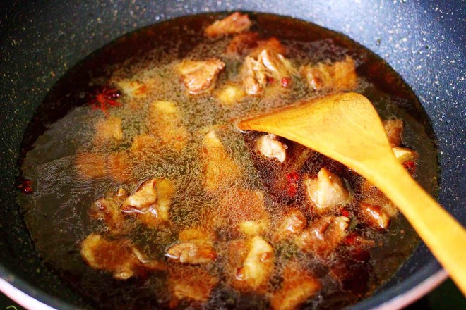 7.鍋中燒熱倒入花生油,放入冰糖小火慢慢炒至融化變成黃色。