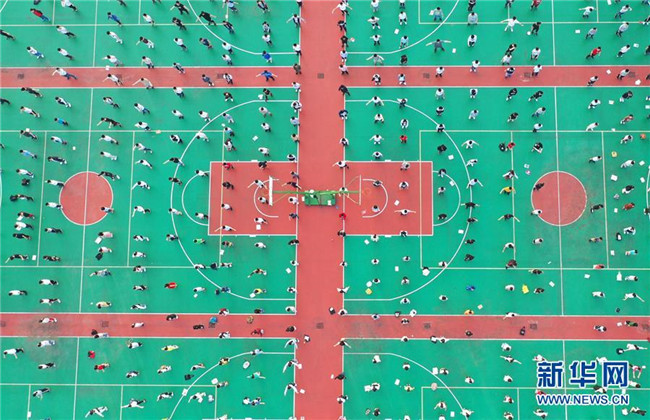 6月4日,在湖南省衡陽(yáng)縣第一中學(xué),高三學(xué)生做早操(無(wú)人機(jī)拍攝)。新華社發(fā)(曹正平攝)