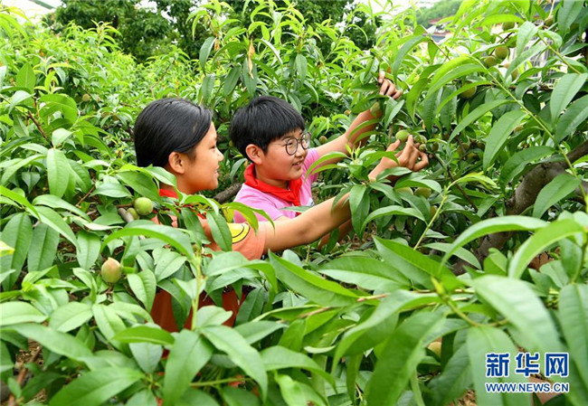 6月17日,樂亭縣毛莊鎮(zhèn)松各莊小學(xué)的學(xué)生在校園勞動(dòng)實(shí)踐基地果園內(nèi)觀察桃子的長勢。新華社記者楊世堯攝