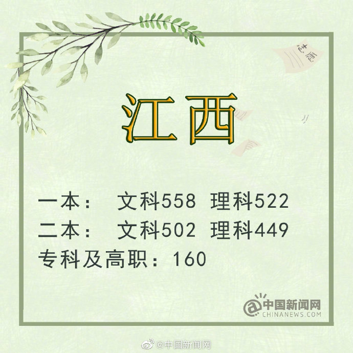 6月23日,江西省2019年高考分數(shù)線公布:第一批本科文史類558分、理工類522分;第二批本科文史類502分、理工類449分;文史、理工類高職(???:160分。