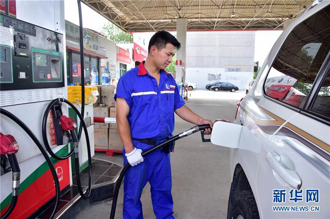 6月25日,河北省石家莊新樂市一加油站工作人員在給汽車加油。新華社發(fā)(賈敏杰 攝)