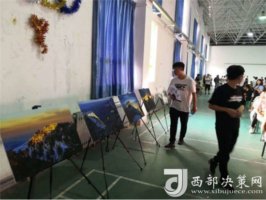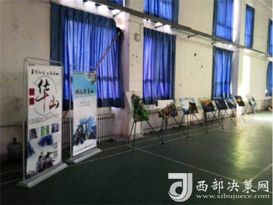 “演繹經(jīng)典”校園活動開場前,舞臺前方的投影大屏循環(huán)播放華山風光宣傳片,奇險峻秀的大美華山風光引得現(xiàn)場觀眾贊嘆不絕。舞臺下方分別通過華山風光攝影展、活動展架等形式展示了華山四季的絕美風光,吸引眾多師生駐足觀看。