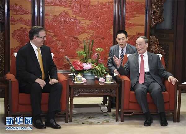 7月1日,國(guó)家副主席王岐山在北京中南海會(huì)見(jiàn)墨西哥外長(zhǎng)埃布拉德。新華社記者殷博古攝