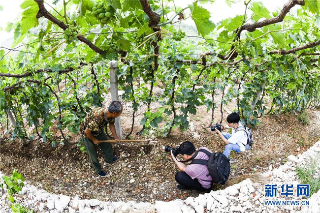 7月2日,河北傳媒學院的學生在河北遵化市新店子鎮(zhèn)沙石峪村葡萄園里采訪拍照。 新華社發(fā)(劉滿倉 攝)