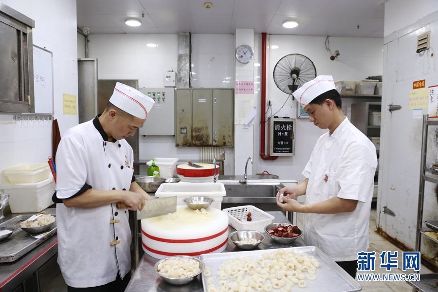 點心師傅用荔枝在創(chuàng)作菜肴。新華網(wǎng) 林曉蕾攝