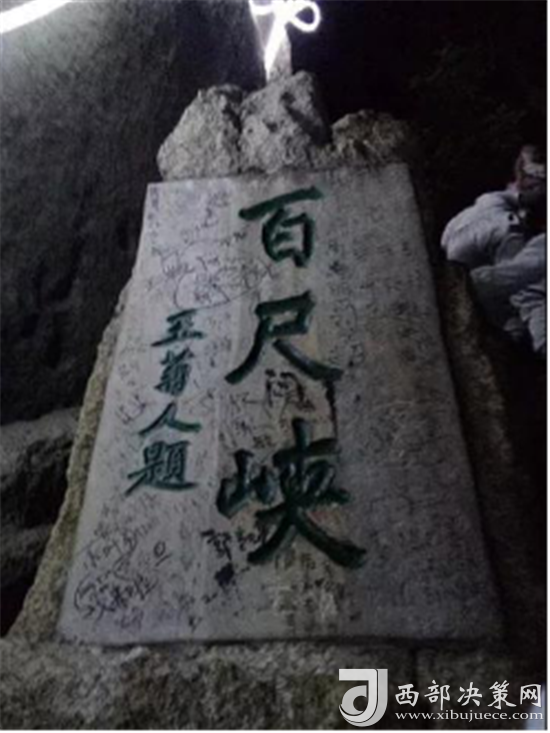 第一道險(xiǎn)關(guān)是千尺幢。未到千尺幢,先到“回心石”。游人走到這里,往前一看,到處是危崖峭壁,不覺望而生畏,有很多就不敢往前走了,“回心石”由此得名。