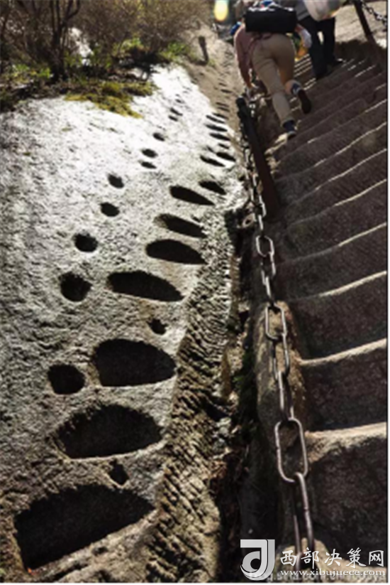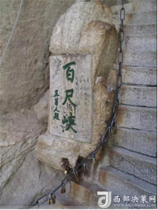 第二道險(xiǎn)關(guān)是百尺峽。這里兩壁高聳,中間夾著一塊從天而降的巨石,上刻“驚心石”三個(gè)大字,游人從石下小路穿過,確實(shí)驚心動(dòng)魄。第三道險(xiǎn)關(guān)是老君犁溝,這是夾在陡峭石壁之間的一條溝狀險(xiǎn)道,有570多個(gè)石階。相傳這里原先根本沒有路,太上老君見了,就將手中的如意柄變成一張鐵犁, 又牽來青牛,一夜間犁成了這條山溝。傳說青牛犁完溝后,見華山景色壯美,便化為石牛,永遠(yuǎn)地留在了華山之上。溝的盡頭是一道陡壁, 名為“猢猻愁”。顧名思義,連猴子都發(fā)愁,可見這里的山勢(shì)多么陡峭。