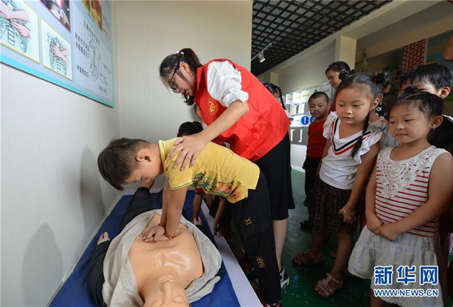 8月8日,在汶上縣劉樓鎮(zhèn)安全教育體驗(yàn)基地,小朋友在工作人員指導(dǎo)下學(xué)習(xí)心肺復(fù)蘇技巧。