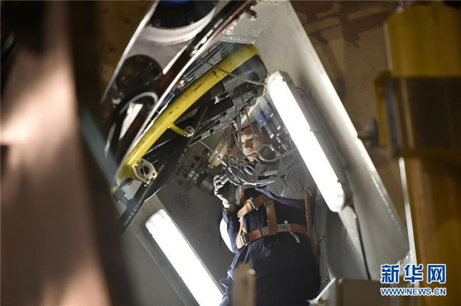 工人在沈陽北方重工集團一部在造的掘進機內部作業(yè)(2016年12月7日攝)。新華社記者 姚劍鋒 攝