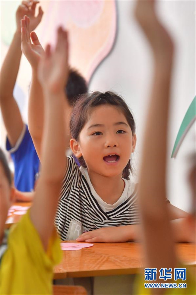 8月17日,在廣西柳州市融安縣“老鄉(xiāng)家園”,羅孝云(右)在“七彩假期”趣味數學課上學習。新華社記者 黃孝邦 攝