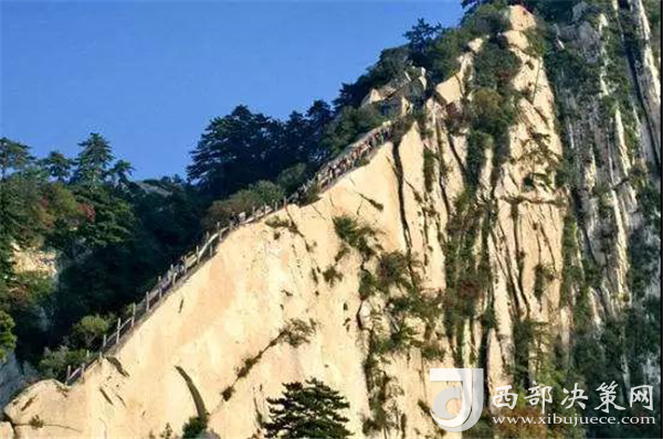 千百年前,陡峭如削的華山,艱險異常,難以登攀,只能“望山興嘆”“遠(yuǎn)而望之”。后來人們循猿徑,依山就勢,巧妙地利用天設(shè)地造的石隙嶺脊,開鑿出了登山道路,始有天下奇觀“自古華山一條路”。