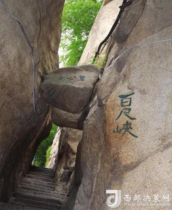 出千尺㠉不遠(yuǎn)是百尺峽,這里是登山第二道險(xiǎn)關(guān)。兩壁高聳,中間夾有一塊從天而降的巨石,上刻“驚心石”三個(gè)大字,游人要從石下小路穿過,確實(shí)驚心動(dòng)魄。此后還有仙人橋、俯渭崖、黑虎嶺等小險(xiǎn)處,就到了登山第三道險(xiǎn)關(guān)老君犁溝,這是夾在陡峭石壁之間的一條溝狀險(xiǎn)道,深不可測,有石階570有余。