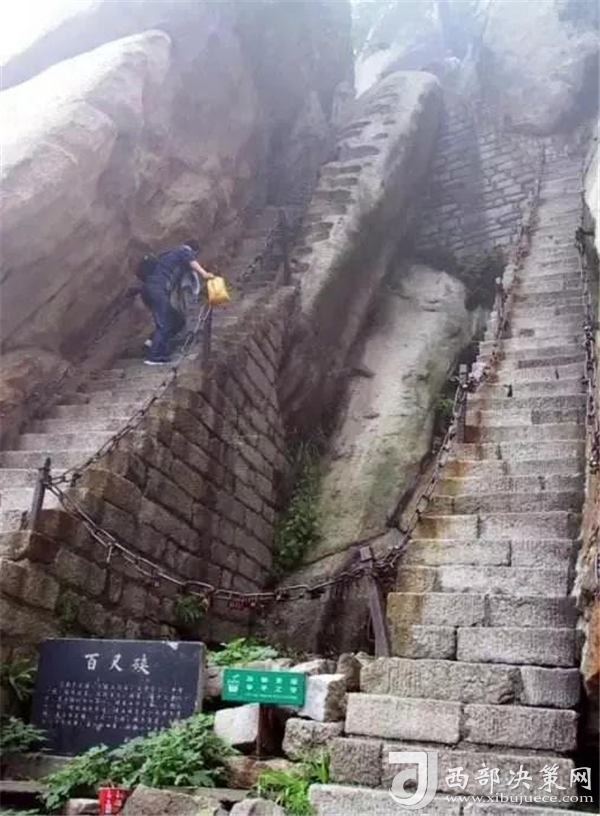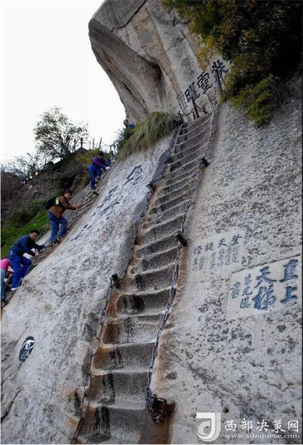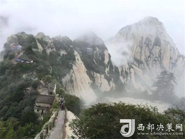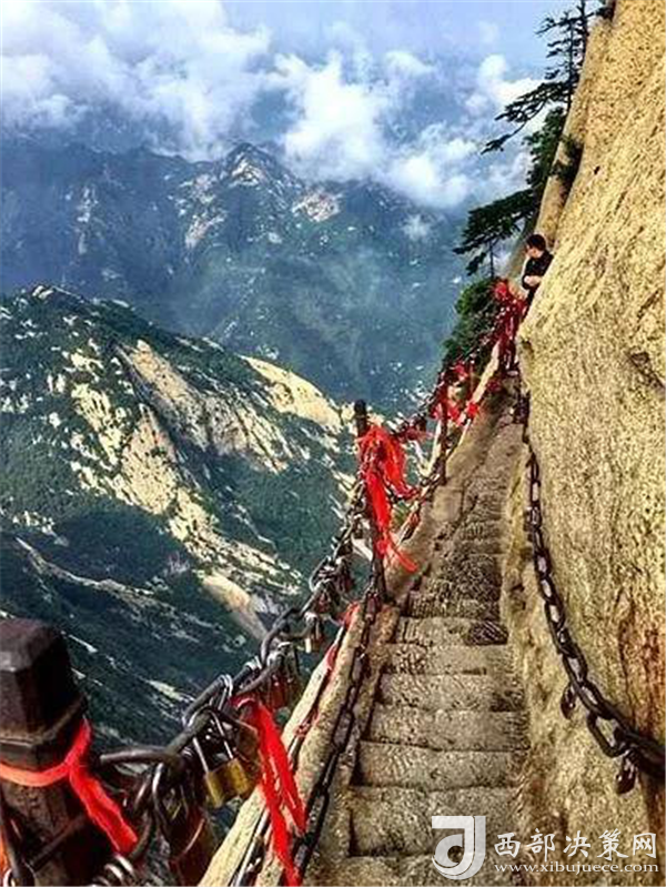 眾所周知,華山在五岳之中以“險峻”著稱。素有“奇險天下第一山”之譽,華山的主體是由一塊完整碩大的花崗巖體構成的,挺拔地屹立在渭河平原。東、南、西三峰拔地而起,如利刃削就。由于華山太險,所以唐代以前很少有人登臨,歷代君王祭祀西岳,也只是在山下西岳廟中舉行大典。據記載,直到魏晉南北朝時期,還沒有通向華山峰頂的道路。唐代才逐漸在北坡沿溪谷而上開鑿了一條險道,也從此有了“自古華山一條路”的說法。