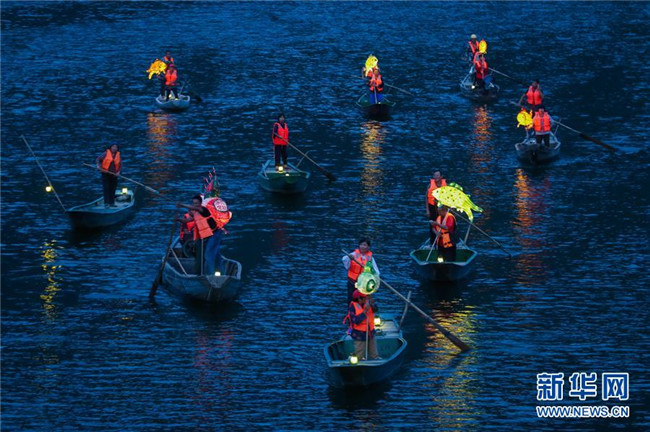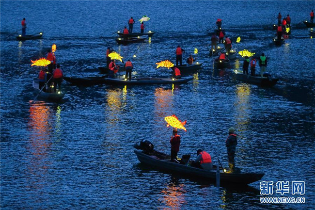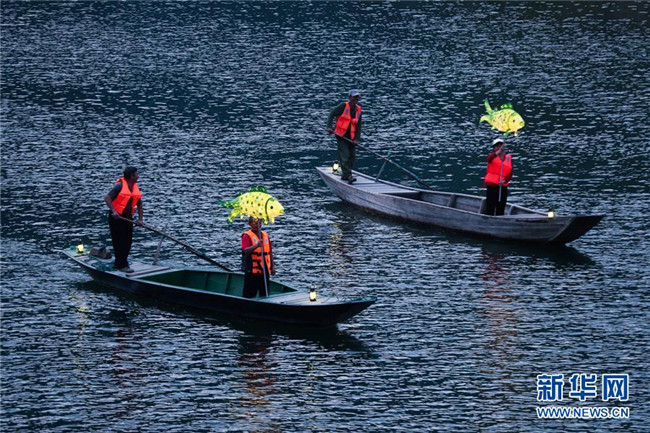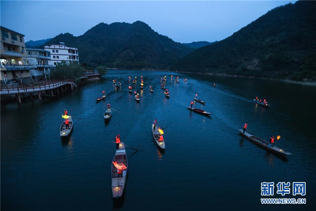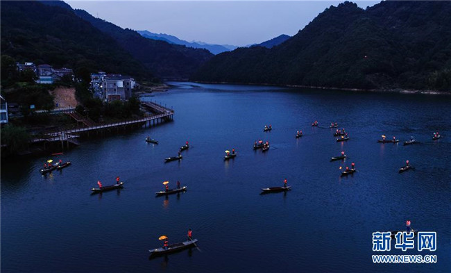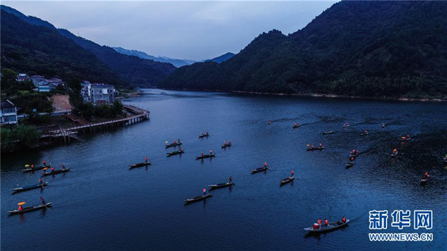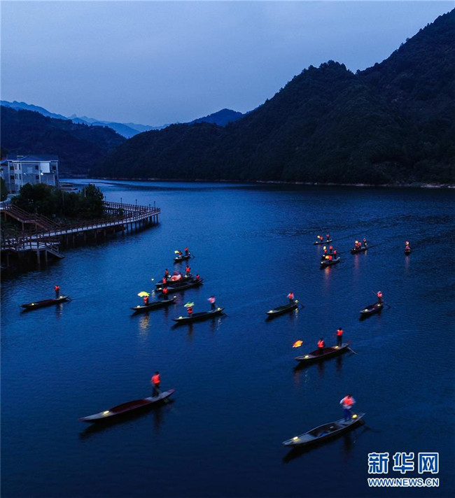 9月25日,在宋村鄉(xiāng)云源港的水面上,漁民劃著漁船,船頭點(diǎn)亮漁燈,構(gòu)成一幅“漁舟唱晚、萬(wàn)家燈火”的美麗圖景,與沿湖民宿群落交相輝映(無(wú)人機(jī)拍攝)。