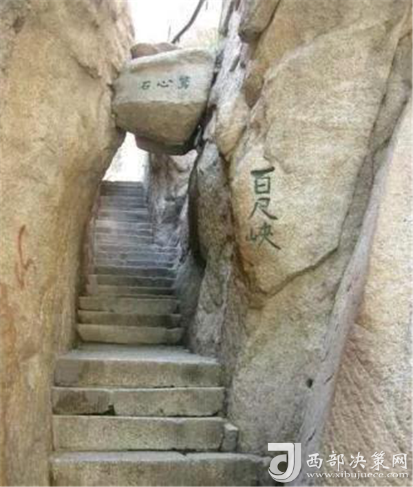 出千尺幢不遠是百尺峽,這里是登山第二道險關(guān)。雖沒有千尺幢那么長,僅46米,石階91級,但仍是華山天險之一。這里勢危坡陡,石壁峭立,通道狹窄,且有懸石,搖搖欲墜。游人至此都心驚膽顫。明顧端木有詩狀其險曰:"幢去峽復(fù)來,天險不可瞬。雖云百尺峽,一尺一千仞。"千尺幢、百尺峽的臺階都是從明末清初開始鑿的,民國時幾經(jīng)加固,解放后又多次修整,一九八五年又鑿復(fù)道,游人上下各行其道。
