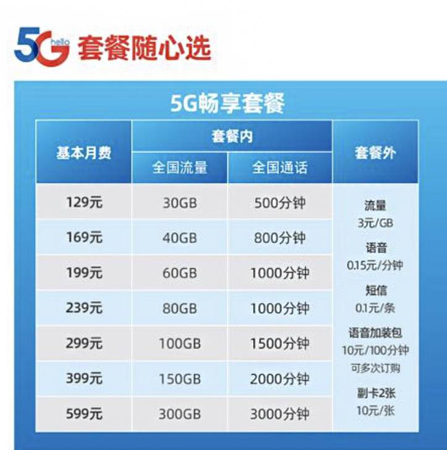 據(jù)記者了解,三大運(yùn)營(yíng)商5G套餐資費(fèi)相差不大。中國(guó)移動(dòng)5G套餐命名為“智享套餐”,分個(gè)人版和家庭版。其中個(gè)人版套餐從128元到598元、家庭版則從169元到869元,各有5檔。