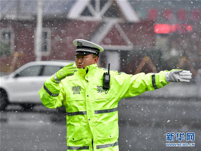 10月31日,在青海省西寧市,交警在雪中指揮車輛。 新華社記者張龍攝