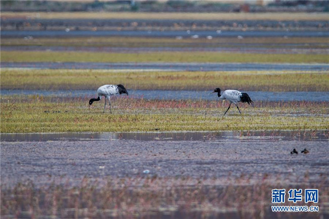 黑頸鶴在納帕海自然保護區(qū)棲息(11月10日攝)。