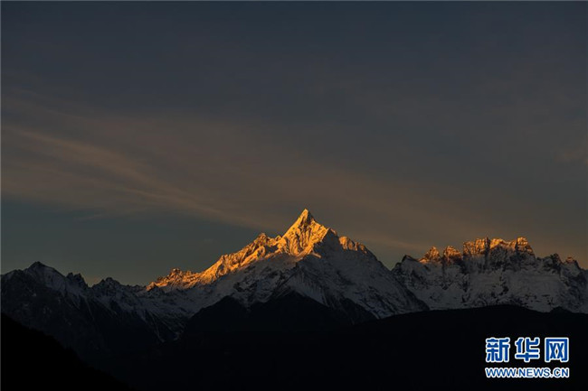 日出時分,陽光照射在梅里雪山緬茨姆峰上(11月8日攝)。