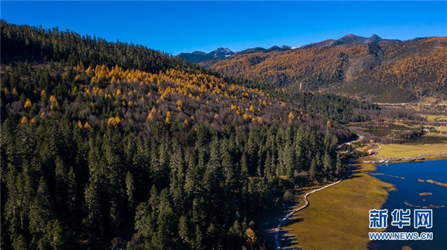 這是無人機拍攝的普達措國家公園一景(11月6日攝)。