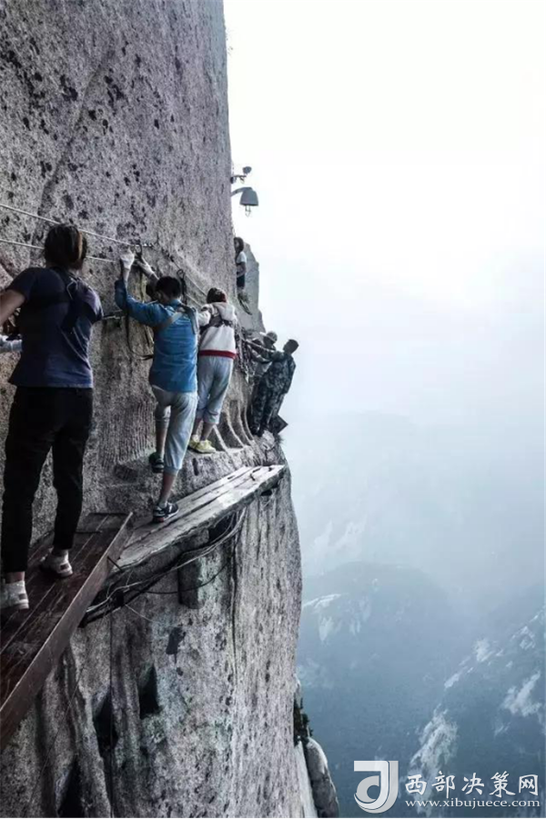 長(zhǎng)空棧道位于華山南峰東側(cè)山腰,是華山派第一代宗師元代高道賀志真為遠(yuǎn)離塵世靜修成仙,在萬(wàn)仞絕壁上鑲嵌石釘搭木椽而筑。長(zhǎng)空棧道的盡頭便是思過(guò)崖。