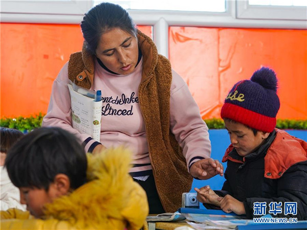 11月19日,在新疆于田縣達里雅布依鄉(xiāng)易地扶貧搬遷安置點的新學校,數(shù)學老師艾比拜木·吾布力艾山在輔導一年級學生做計算題。與該校位于塔克拉瑪干沙漠腹地的舊址相比,新校舍配備了更好的教學設備。新華社記者沈伯韓攝