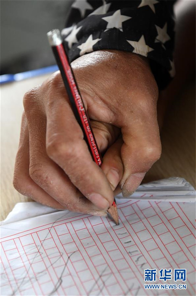 11月19日,在廣西上思縣那琴鄉(xiāng)中心小學(xué)逢通村教學(xué)點(diǎn),梁志雄手把手教學(xué)生寫字。新華社記者陸波岸攝