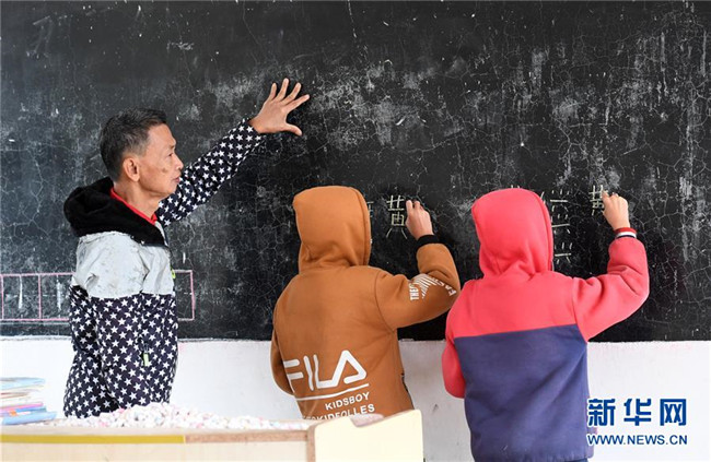 11月19日,在廣西上思縣那琴鄉(xiāng)中心小學(xué)逢通村教學(xué)點(diǎn),梁志雄給學(xué)生上課。新華社記者陸波岸攝