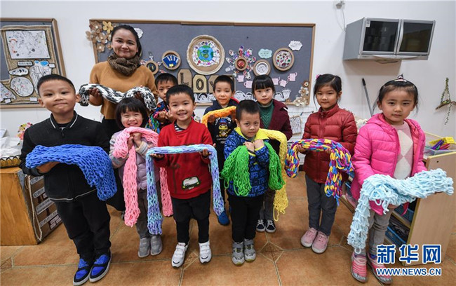 12月11日,小朋友們在老師的帶領(lǐng)下編織愛心圍巾。 新華社記者 徐昱 攝