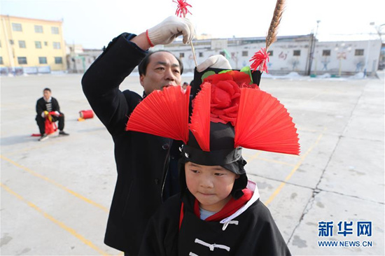 攻鼓子是發(fā)源于甘肅武威的一種民間鼓樂舞蹈,表演風(fēng)格渾厚豪邁、威武雄壯,具有強烈的地域特色。2008年,涼州攻鼓子被列為第二批國家級非物質(zhì)文化遺產(chǎn)。為更好地傳承這項非物質(zhì)文化遺產(chǎn),甘肅省武威市涼州區(qū)四壩鎮(zhèn)九年制學(xué)校組建攻鼓子藝術(shù)社團,開設(shè)攻鼓子校本課,定期由當(dāng)?shù)毓ス淖哟硇詡鞒腥藢W(xué)生進行指導(dǎo),推動“非遺”攻鼓子藝術(shù)教育普及。 新華社記者 耿馨寧 攝