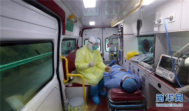 駐守在咸寧中心醫(yī)院的云南醫(yī)療隊醫(yī)療二組組長李波趕赴嘉魚縣人民醫(yī)院,轉運一名新冠肺炎臨床診斷病例(2月21日攝)。新華社發(fā)(楊崢 攝)