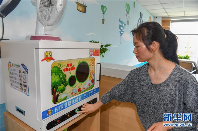7月2日,在長春市少年兒童圖書館平陽社區(qū)繪本主題分館,管理員金敏為圖書進(jìn)行消殺。 新華社記者 張楠 攝