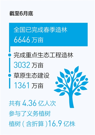 記者從國家林業(yè)和草原局獲悉:今年上半年,全國綠化委員會、國家林業(yè)和草原局科學指導(dǎo)各地各部門在做好疫情防控的同時積極有序開展春季造林綠化。截至6月底,全國已完成春季造林6646萬畝,占全年造林任務(wù)的65.8%;完成重點生態(tài)工程造林3032萬畝、草原生態(tài)建設(shè)1361萬畝。共有4.36億人次參與了義務(wù)植樹,植樹(含折算)16.9億株。