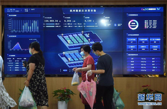 浙江省杭州市的5G農(nóng)貿(mào)市場——駱家莊農(nóng)貿(mào)市場的大屏幕上實時顯示交易、客流等相關情況(5月17日攝)。新華社記者 韓傳號 攝