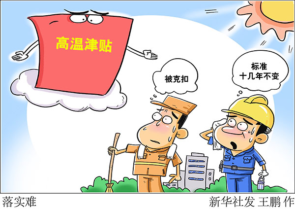 一些地方高溫津貼多年不上調(diào)成為勞動(dòng)者反映較為突出的問(wèn)題。例如,湖南省2005年規(guī)定,高溫津貼標(biāo)準(zhǔn)為每人最低每月150元,這一標(biāo)準(zhǔn)已有十多年未調(diào)整。河南、廣東等地的高溫津貼標(biāo)準(zhǔn)也都十來(lái)年沒(méi)有調(diào)整過(guò)。