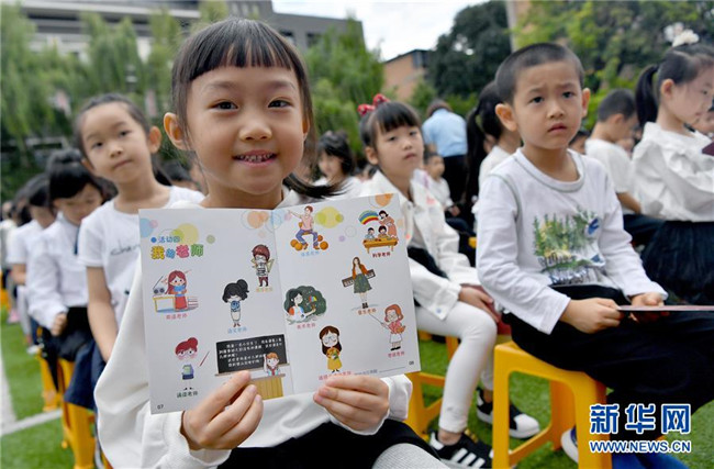 8月31日,西安市新城區(qū)后宰門小學(xué)一年級新生在開學(xué)典禮上展示自己的“入學(xué)護(hù)照”。 當(dāng)日,陜西西安市的多所中小學(xué)迎來秋季開學(xué)報(bào)到。 新華社記者 劉瀟 攝