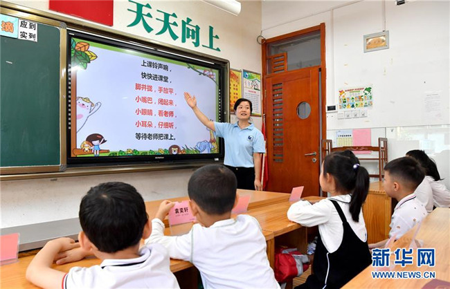8月31日,西安市新城區(qū)后宰門小學(xué)向日葵班的老師在給一年級新生講解上課規(guī)則。 當(dāng)日,陜西西安市的多所中小學(xué)迎來秋季開學(xué)報(bào)到。 新華社記者 劉瀟 攝