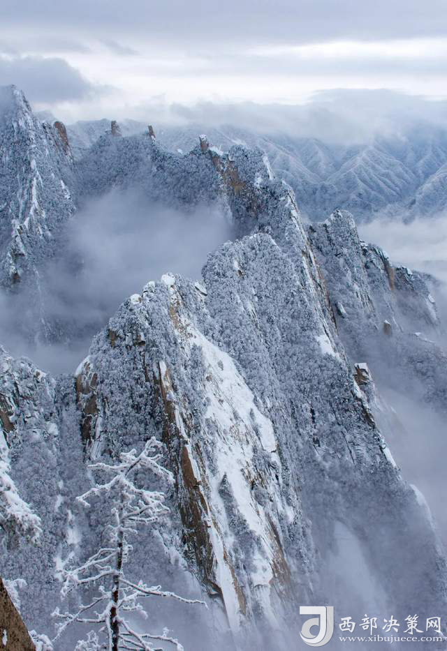 西岳華山,有東、西、南、北、中,五座山峰,其中東、西、南三峰呈鼎形相依,周圍各小峰環(huán)衛(wèi)而立。
