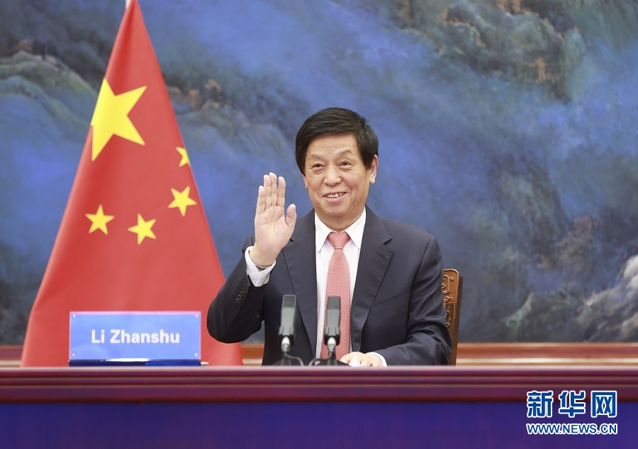 1月18日,全國人大常委會(huì)委員長栗戰(zhàn)書在北京人民大會(huì)堂出席全國人大和柬埔寨國會(huì)視頻交流活動(dòng)開幕式。 新華社記者 丁林 攝
