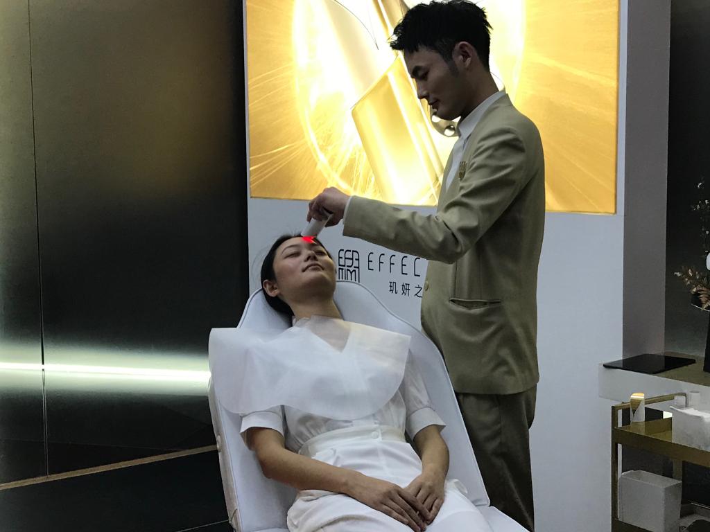 圖為消費者體驗“EFFECTIM璣妍之光”的首發(fā)新品。新華社記者 周蕊 攝