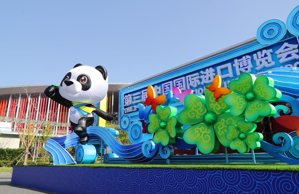 國家會展中心(上海)西入口處擺放的熊貓“進寶”主題進博會裝飾(2020年10月23日攝)。新華社記者 方喆 攝