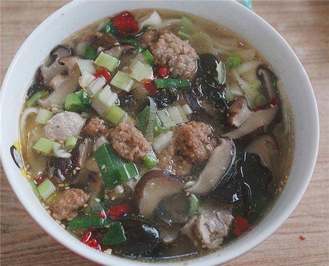一碗18元的香菇面,里頭有香菇、蝦米、木耳、里脊肉片、汆肉丸子和油炸丸子等原料,再撒上蔥蒜和辣椒,香氣四溢。“以前還要放排骨和酥肉呢。”香菇面店的老板李瑞強(qiáng)說,父親1988年開始賣香菇面,父親去世后,他在鎮(zhèn)上開了店,希望能將這份味道長(zhǎng)長(zhǎng)久久傳承下去。