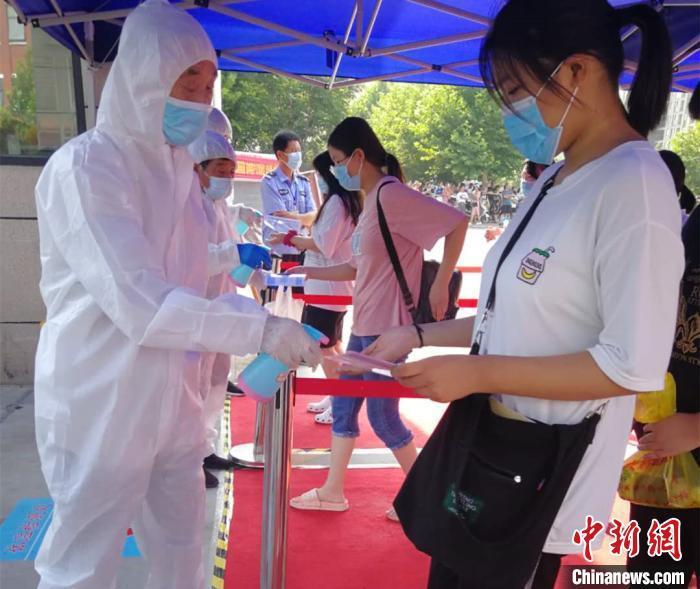 資料圖:2020年7月7日,河南鄭州,醫(yī)務人員為進入考點的考生進行體溫檢查和消毒。河南省衛(wèi)健委供圖
