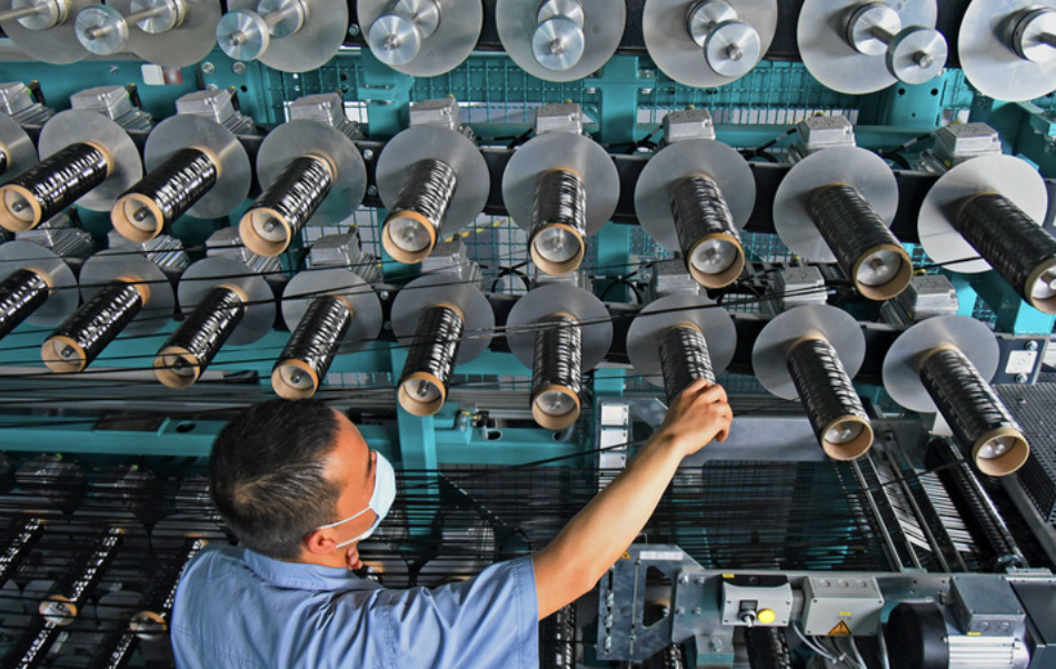 在江蘇連云港經(jīng)濟(jì)技術(shù)開發(fā)區(qū),工人在查看碳纖維生產(chǎn)線運(yùn)行情況。新華社發(fā)(耿玉和 攝)