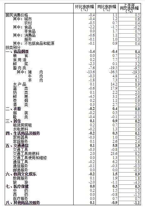 其他七大類價格同比六漲一降。其中,交通通信、教育文化娛樂、居住價格分別上漲5.8%、1.5%和0.9%,衣著、生活用品及服務(wù)、醫(yī)療保健價格分別上漲0.4%、0.3%和0.3%;其他用品及服務(wù)價格下降0.9%。